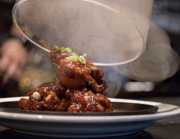 Evolving as the years progressed, today there are four flavors and three styles of Korean fried chicken available for chicken lovers. “Dankganjeong” is the most traditional flavor of KFC, and is considered by some to be the Korean version of orange chicken. It’s fried twice using potato or corn starch mixed with seasoning, and glazed with a sweet garlic soy sauce. One LA-based restaurant that’s fittingly named and known for their dankganjeong is The Gangjung. They offer an array of flavors from garlic to barbeque. Out east in New York, modern Korean soul food gastropub, Windrose, provides an upscale presentation using a cloche as a makeshift smoker that when removed reveals glistening dankganjeong.
