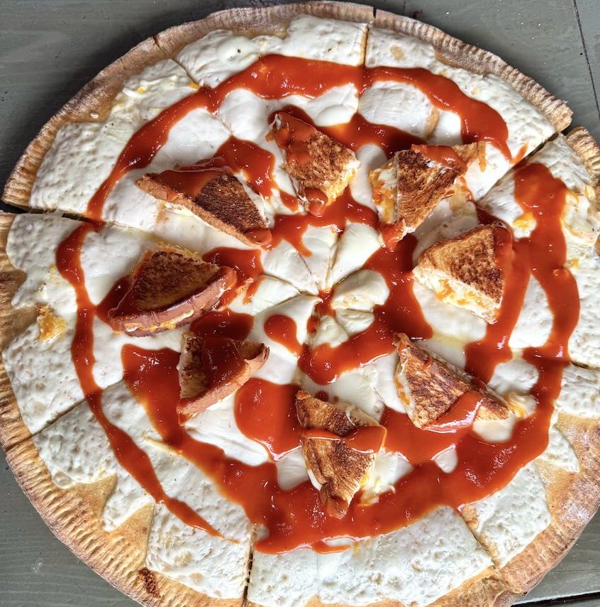 Baked on unbleached, unbromated pizza dough and stuffed with a combination of cheddar, American, pepper jack, and mozzarella cheeses, the pie is topped with a tomato soup sauce and mini grilled cheese sandwiches. It is served with a cup of tomato soup on the side for dipping.