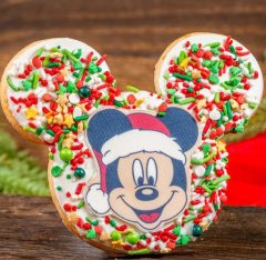 Shortbread cookie dipped in white chocolate with holiday sprinkles and chocolate Mickey decoration. (New)