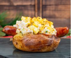 Sausage Potato with pickled pineapple and teriyaki sauce topped with mac salad on a baked potato. (New)