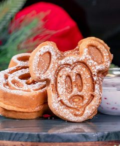 Mickey-shaped waffles flavored with gingerbread spices, topped with powdered sugar, served with a side of syrup. (New)