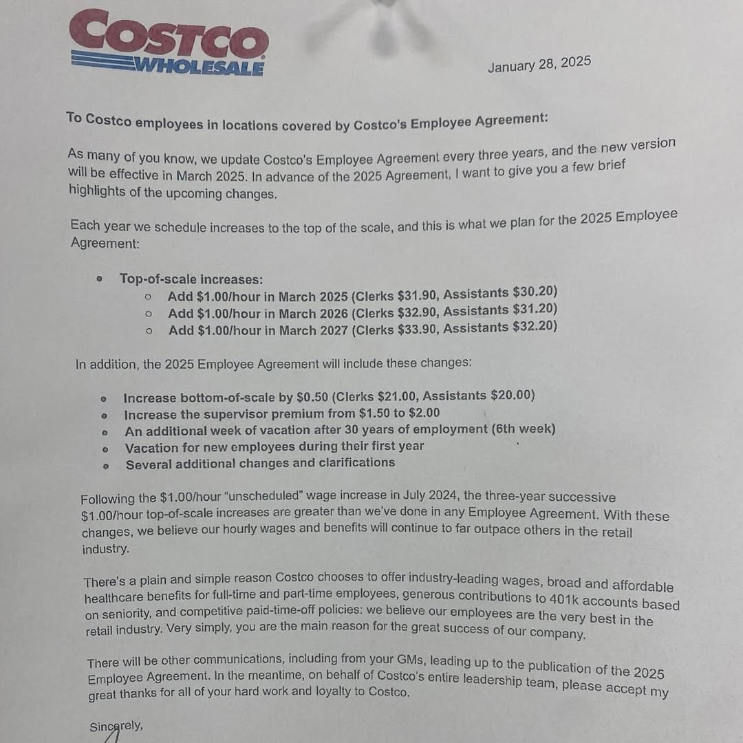 “There’s a plain and simple reason Costco chooses to offer industry-leading wages,” Vachris said in the memo. “We believe our employees are the very best in the retail industry.”