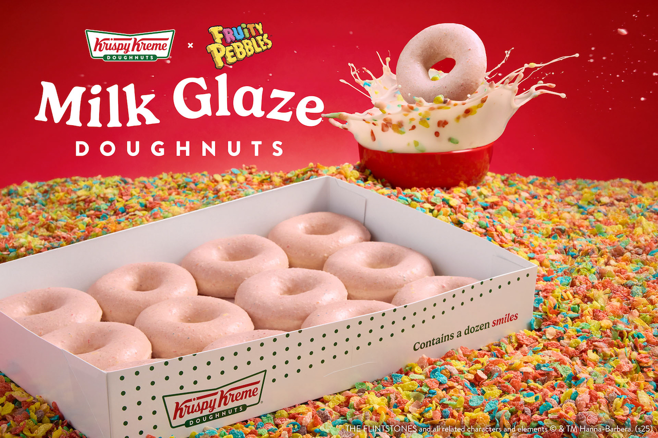 Earlier this month, Pebbles and Krispy Kreme collaborated for a Fruity Pebbles Milk Original Glazed Donut. Each doughnut is glazed with cereal milk to captures the sweet fruity taste.