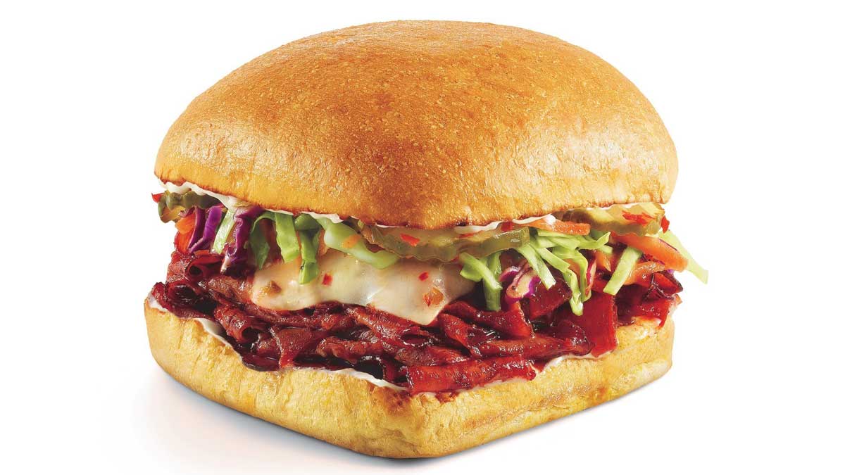 The sub is loaded with slow-smoked USDA Choice beef brisket that’s sliced up and coated with a spicy Nashville Hot seasoning. It’s then topped with spicy pickle chips, mayonnaise, a sweet and tangy coleslaw, and melted pepper jack cheese on a toasted cornbread roll.