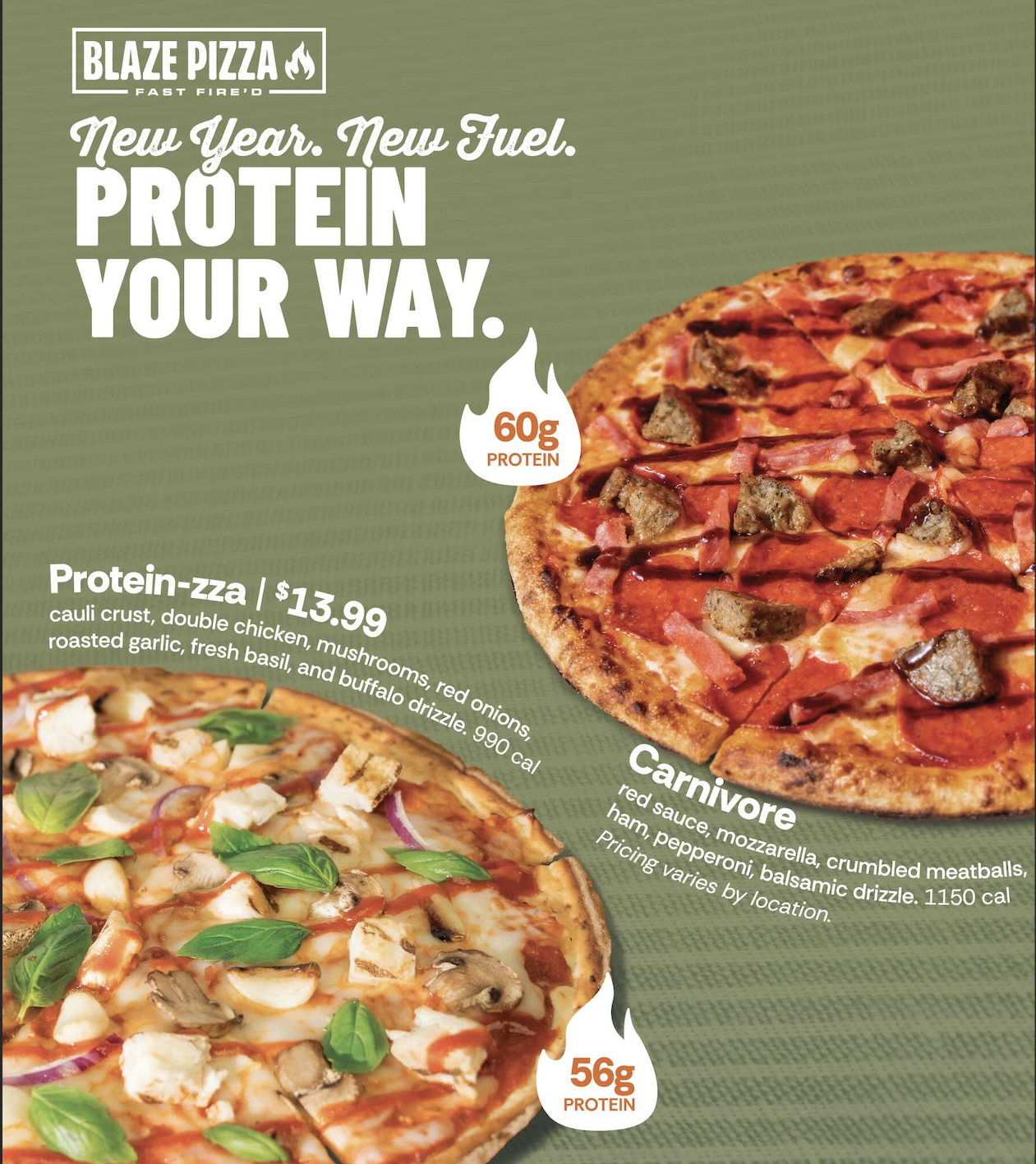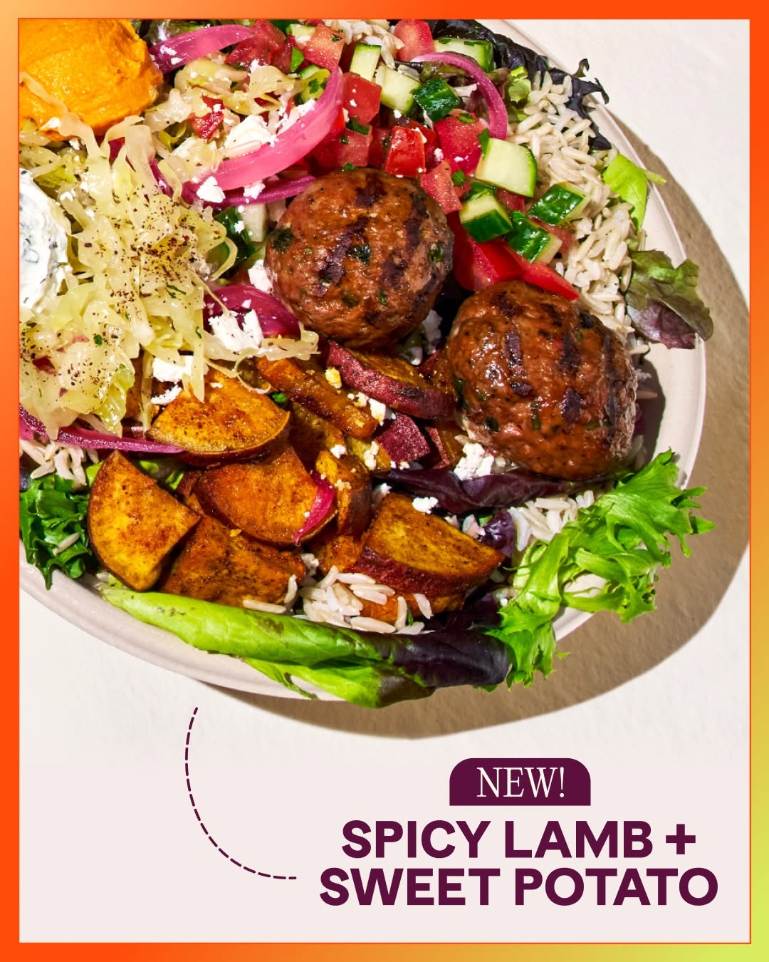 - Spicy Lamb + Sweet Potato Bowl: A hearty bowl that fuels you. Featuring spicy lamb meatballs and white sweet potatoes, plus new Power Greens and brown rice for a good source of fiber. Joined with tzatziki, red pepper hummus, sumac slaw, pickled onions, feta, cucumber, tomatoes, and tahini Caesar.