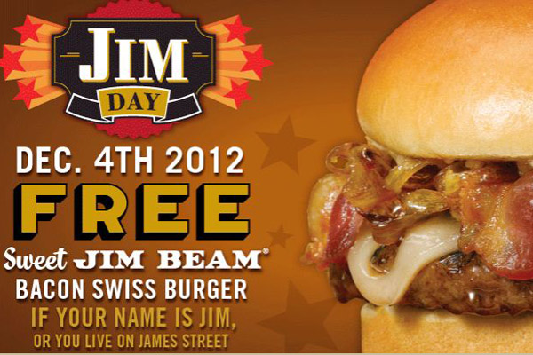 Red Robin is celebrating the renown holiday affectionately referred to as “Jim Day” (whatever that is) on December 4 (that’s today, folks) and giving away free Sweet Jim Beam Bacon Swiss burgers at participating restaurants. The only stipulation is that you have to be named Jim, Jimmy, James, Jaime, or some variation thereof. Oh, and you also have to be at least 18 years old to redeem the offer… and you have to show valid identification… and it’s dine-in only. All you non-Jims feeling a little left out? No worries. If you live on any street of Jim-related nomenclature, you can also redeem the offer – with proof of address, of course.