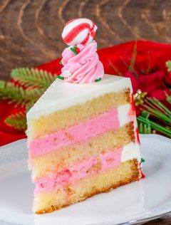 White cake soaked in peppermint simple syrup, layered with chocolate ganache, peppermint mousse, and peppermint crunch, and finished with buttercream, holiday sprinkles, and mint candy. (New)