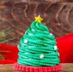 Green-colored gray stuff mousse with a brown sugar cake and lingonberry jam center topped with holiday sprinkles and a white chocolate star. (New)