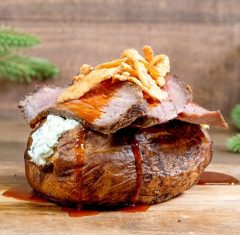 Russet potato with sliced tri-tip steak, spinach-artichoke dip, demiglace, and crispy onions. (New)