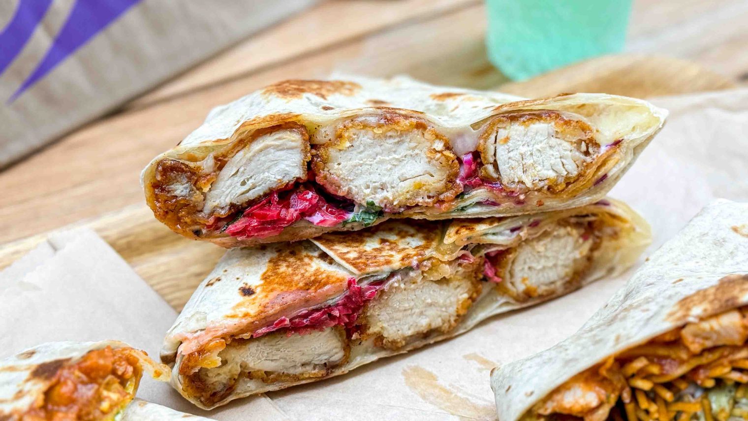 This bold re-imagination boasts marinated, freshly fried chicken nuggets tossed in Salsa Macha, wrapped up with shredded cheese, a tangy purple cabbage slaw, and a kick from a zesty Apricot Hot Sauce. It’s all balanced out with a cool dollop of reduced-fat sour cream, and of course, that warm tortilla hug. This remix doesn’t just aim to satisfy—it’s here to bring the heat.